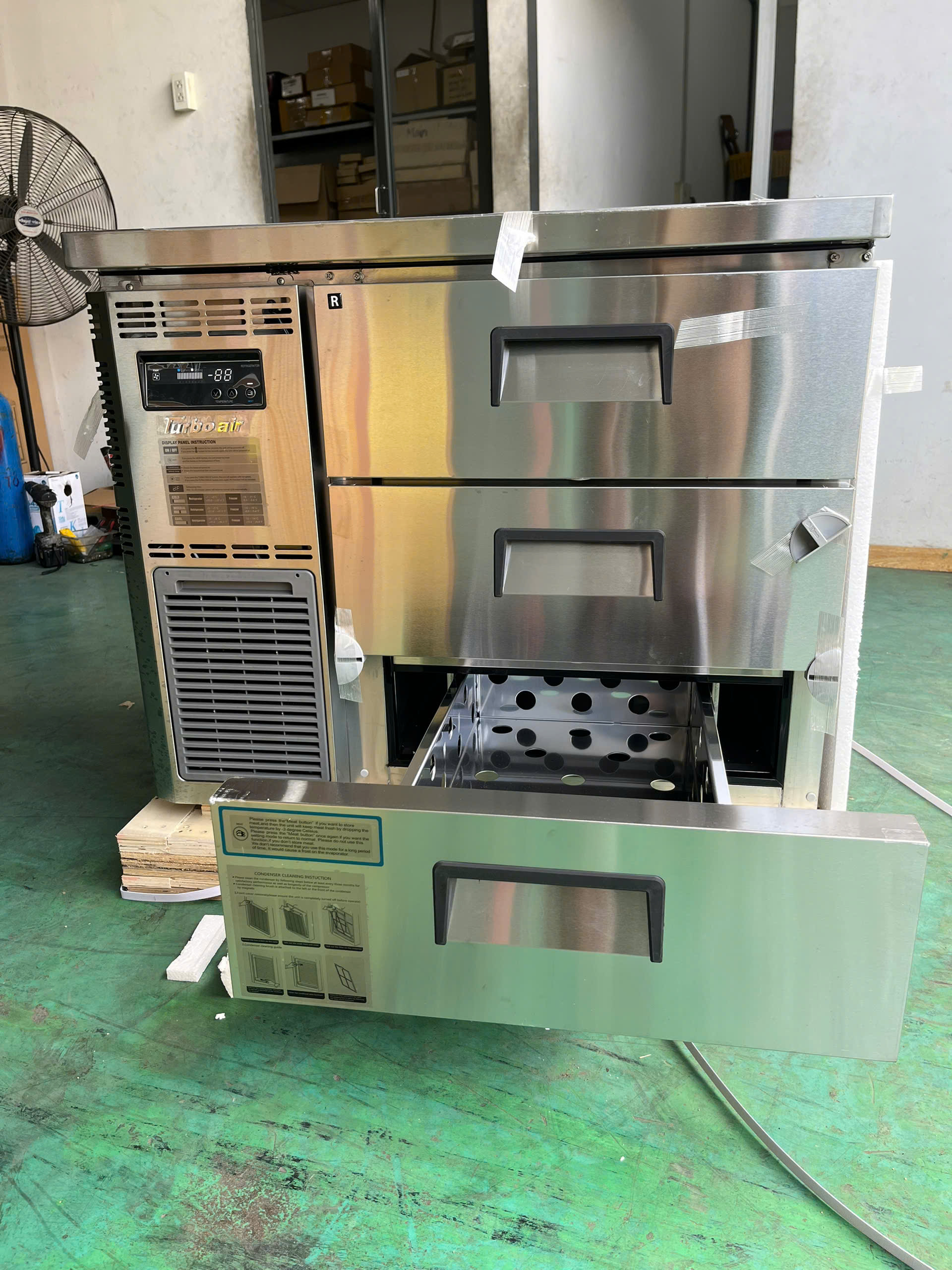 Turbo Air KUR9-3D-3 là mẫu bàn mát inox dạng 3 ngăn kéo, với kích thước gọn 0.9m, dung tích 198 lít. Thiết kế này giúp bạn phân loại và bảo quản nguyên liệu hiệu quả, vừa đảm bảo nhiệt độ từ 1℃ đến 8℃, vừa thuận tiện trong quy trình thao tác bếp. Sản phẩm lý tưởng cho nhà hàng, quán ăn, bếp trung tâm hoặc bếp mở nhỏ gọn.